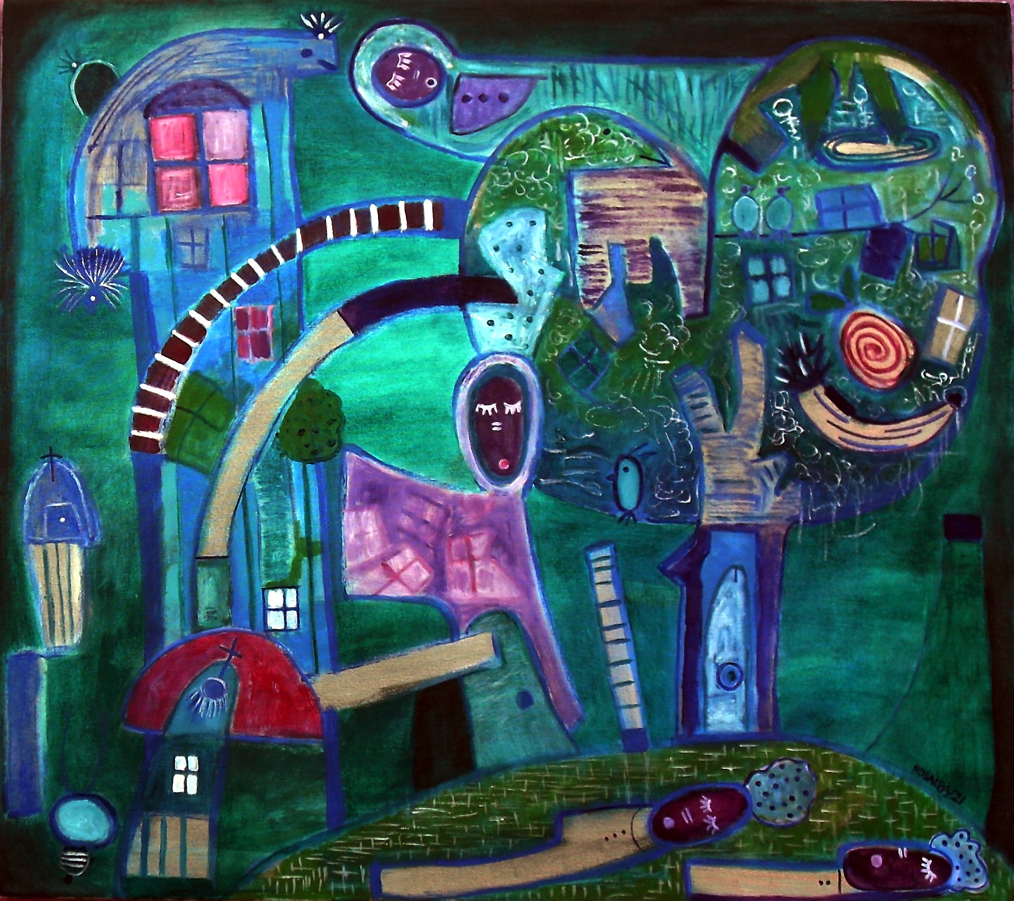 En esa dimensión en donde tales contradicciones son válidas, llegando a integrarse los contrarios, en las profundidades de un ser con un universo interior, en donde la pulsión tanática es vencida por el impulso vital, que llega a saturar de círculos ondeantes de femineidad, recordando la redondez de lo primario, hasta llegar a lo infantil, en una ingenua creatividad plagada de explosiones cromáticas fuertes y contrastantes, significando la necesidad del llenamiento de un vacío que a través de la creatividad se vuelve espacio fecundo, como formas germinales por la implosión de catexias que se defienden presurosamente ante la destrucción y la muerte.