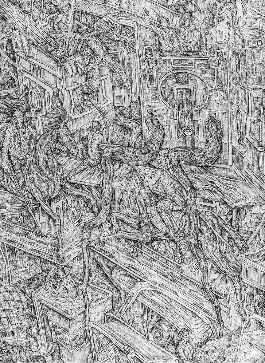 Esta obra se realizó durante el periodo de transición de aislamiento al comienzo de la pandemia, como una meditación tanto en el dibujo arquitectónico de carácter vernáculo y autóctono, en honor a las cárceles del gran maestro Piranesi. En estos paisajes se entrevé la desolación, el miedo, la penumbra, pesadez y la enigmática realidad que se vivió y aún vive en ciertos lugares.