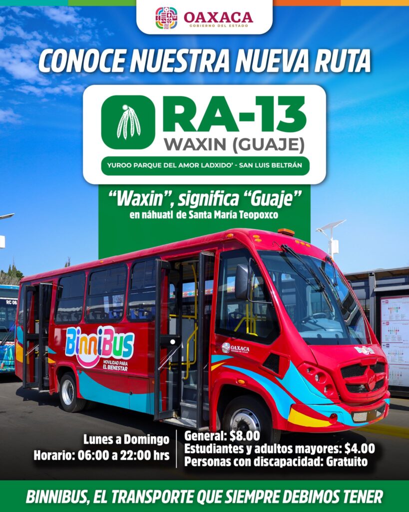 Oaxaca de Juárez, Oax. 26 de febrero de 2026.- A fin de ampliar las opciones de movilidad en la Zona Metropolitana de Oaxaca, el Gobierno del Estado a través del Sistema de Transporte Colectivo Metropolitano BinniBus, puso en marcha este jueves la ruta RA-13 “Waxin”, cuyo nombre significa “guaje” en lengua náhuatl de Santa María Teopoxco.