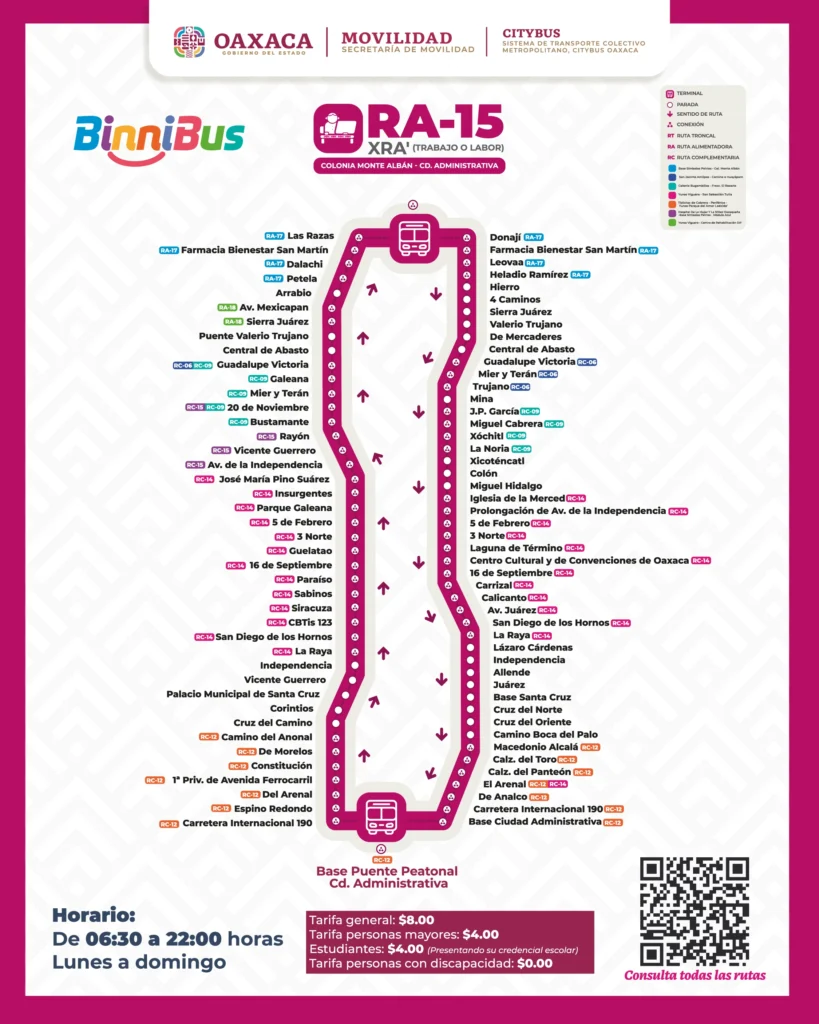 Oaxaca de Juárez, Oax.,a 26 de noviembre de 2025. El Sistema de Transporte Colectivo Metropolitano BinniBus Oaxaca inició la operación de la ruta RA-15 “Xra” que significa Trabajo o Labor en Chocholteco, la cual conecta a la Colonia Monte Albán con Ciudad Administrativa.