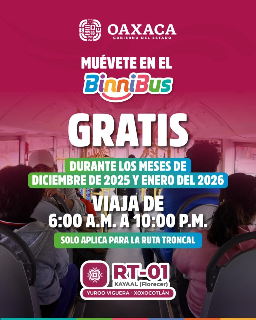 Oaxaca de Juárez, Oax. 1 de diciembre de 2025.- El Sistema de Transporte Colectivo Metropolitano BinniBus Oaxaca informa que la etapa preoperativa de la Ruta Troncal Yuroo Kayaal Viguera–Yuroo Xoxocotlán, continuará ofreciendo servicio gratuito durante todo el mes de diciembre y enero de 2026, para fortalecer la economía familiar y facilitar la movilidad en uno de los tramos de mayor demanda.