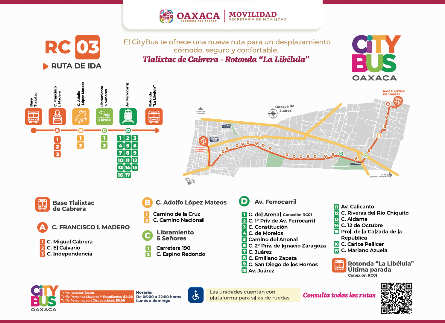 San Antonio de la Cal, Oax. 15 de marzo de 2024.- La Secretaría de Movilidad (Semovi) informa que este 15 de marzo inició la Ruta RC03 del Sistema de Transporte Colectivo Metropolitano (Citybus), que cubrirá el trayecto del municipio de Tlalixtac de Cabrera al Crucero de 5 Señores en la capital oaxaqueña.