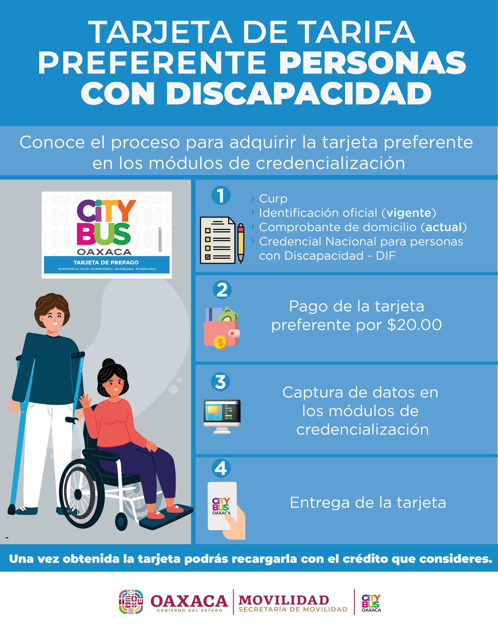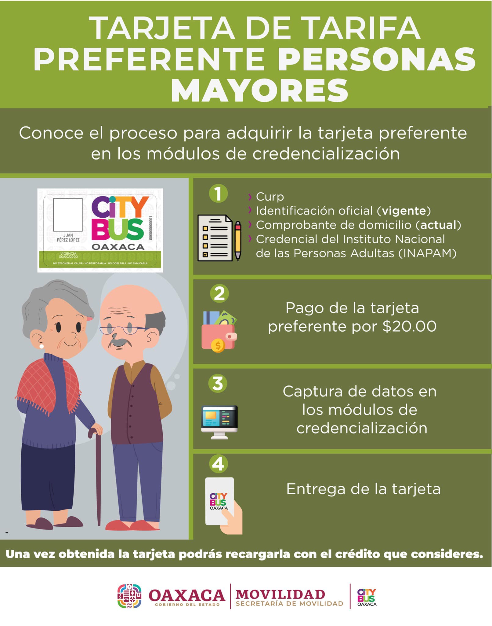 En CityBus siempre estamos innovando para ti, es por ello que ofrecemos tarifas preferenciales para ciertos sectores de la población oaxaqueña. Además de la tarjeta General, ofrecemos la tarjeta CityBus preferente para Adultos Mayores, Estudiantes y Personas con Discapacidad.