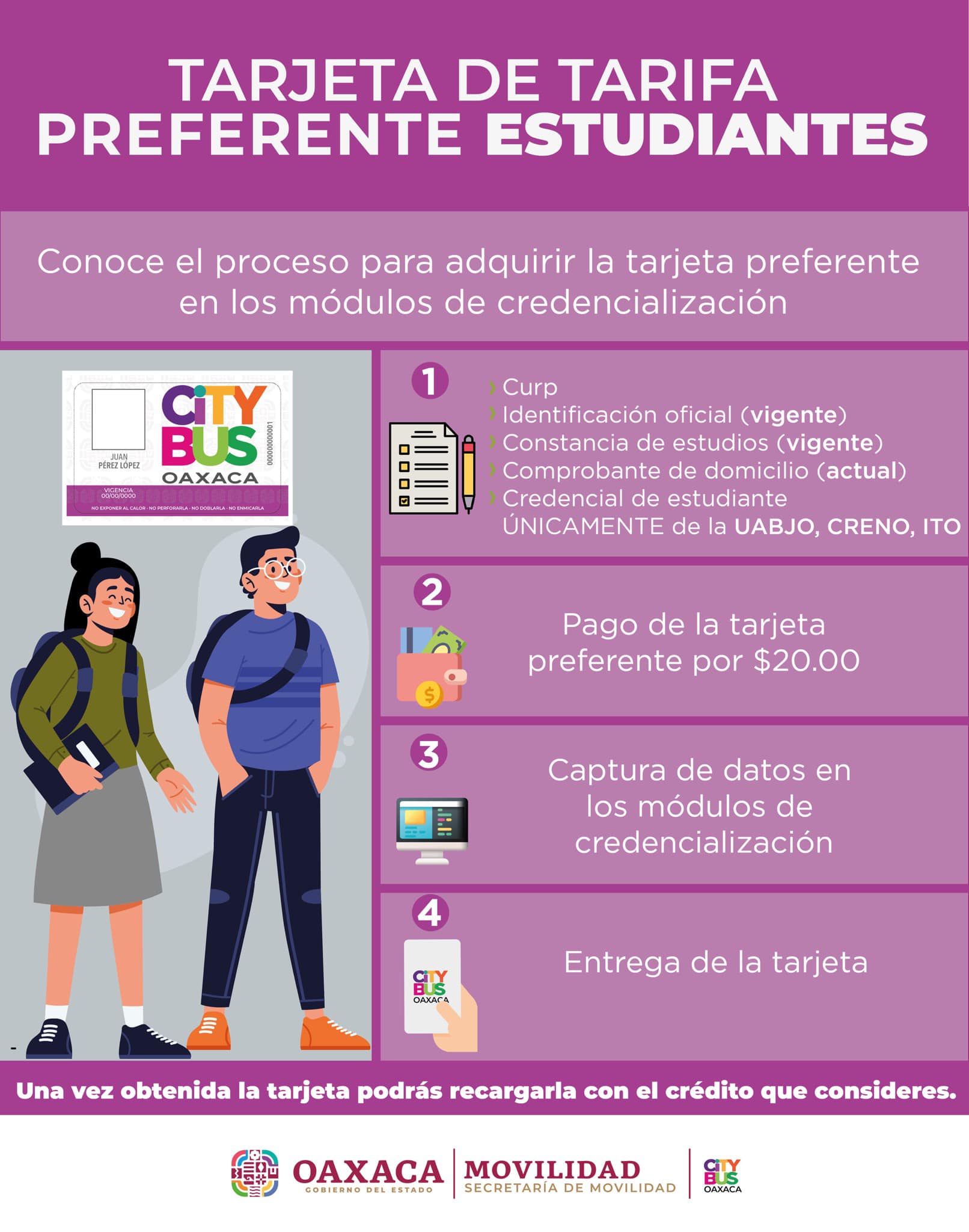 Si ya tienes tu tarjeta CityBus preferente, ahora tendrás que recargar saldo en los más de 30 cajeros distribuidos a lo largo de la Zona Metropolitana de Oaxaca de Juárez. Puedes ponerle desde 1 peso hasta lo que quieras, pero siempre ten en mente la tarifa que ahora pagarás con tu tarjeta CityBus: