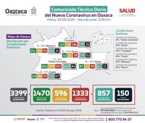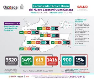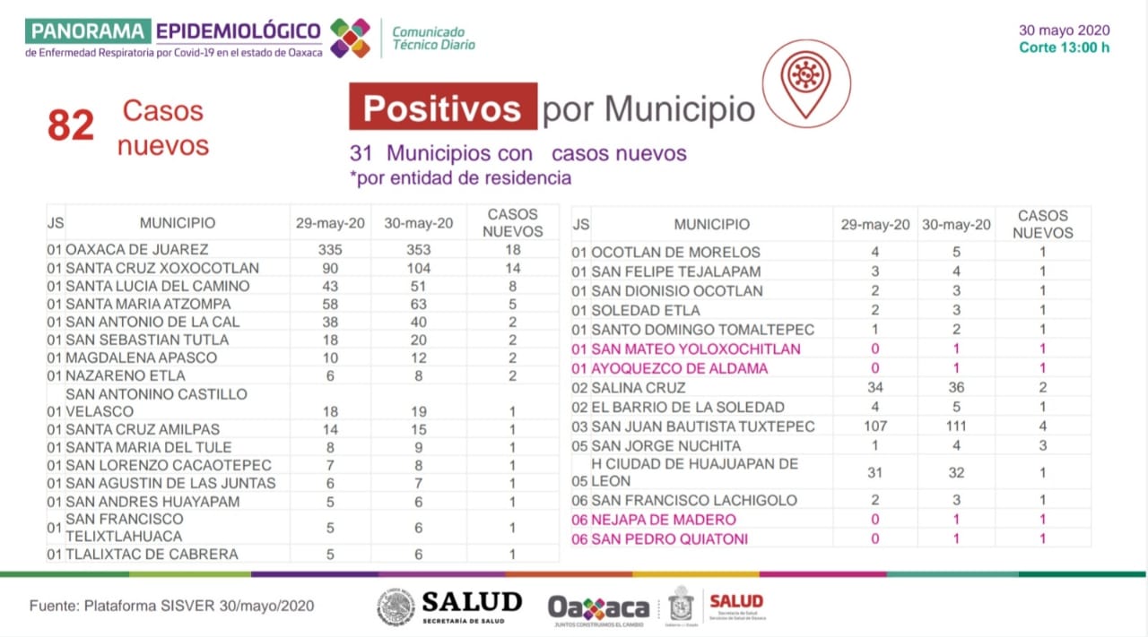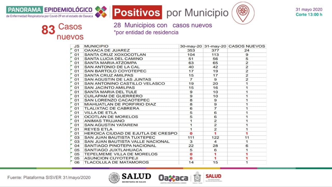 Mencionó que la presencia del virus se ha esparcido en 152 municipios del territorio oaxaqueño, tres más que el día de ayer, ya que se agregaron a la estadística de positivos las localidades de Heroica Ciudad de Ejutla de Crespo, Tepelmeme Villa de Morelos, Asunción Cuyotepeji, cada una con un confirmado.