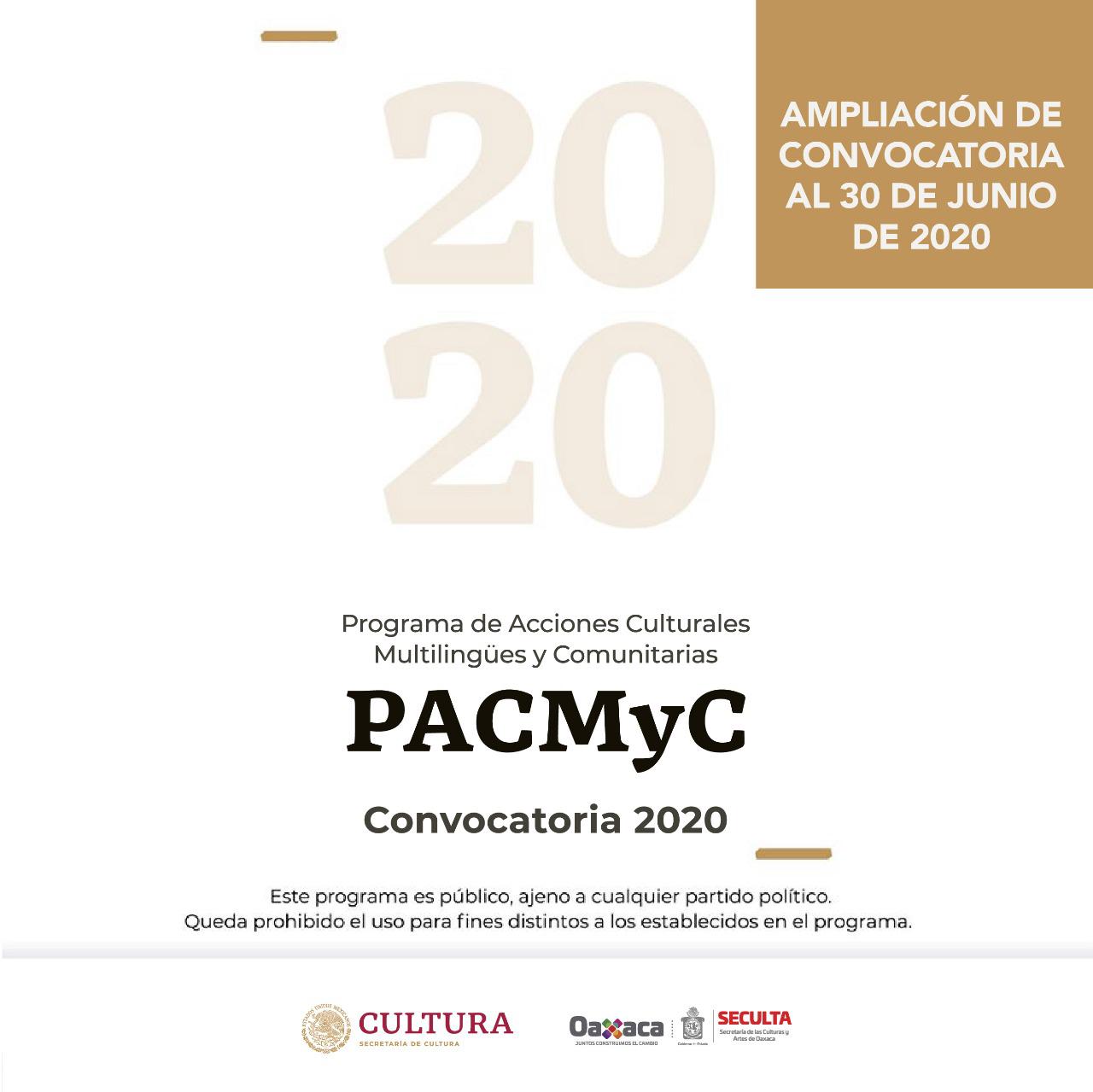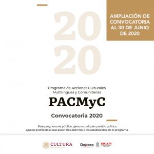 Oaxaca de Juárez, Oax. 30 de mayo de 2020.- La Secretaría de las Culturas y Artes de Oaxaca (Seculta) informa que la Dirección General de Culturas Populares, Indígenas y Urbanas (DGCPIU) anunció que la Convocatoria del Programa de Acciones Culturales, Multilingües y Comunitarias (PACMyC 2020) se amplía hasta el 30 de junio del año en curso derivado de las acciones de prevención por el COVID-19.
