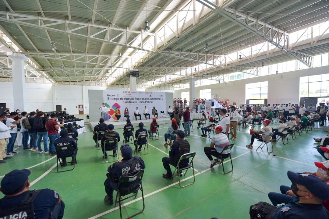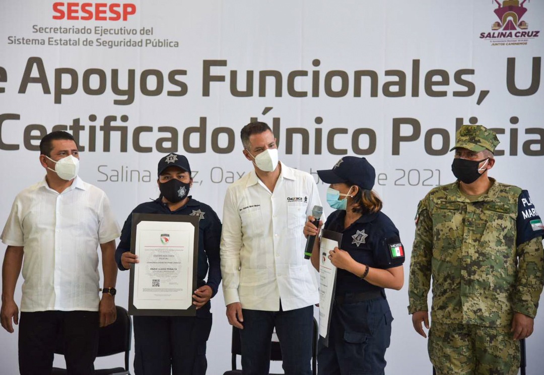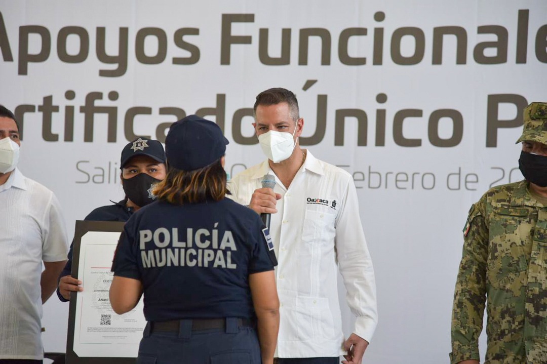 Para dignificar la labor de las y los elementos de seguridad pública municipal, el Mandatario Oaxaqueño entregó 50 uniformes y 37 Certificados Únicos Policial; estos apoyos requirieron 182 mil pesos y contribuyen a la certeza de la población de que cuentan con elementos capacitados para el desempeño de sus funciones.