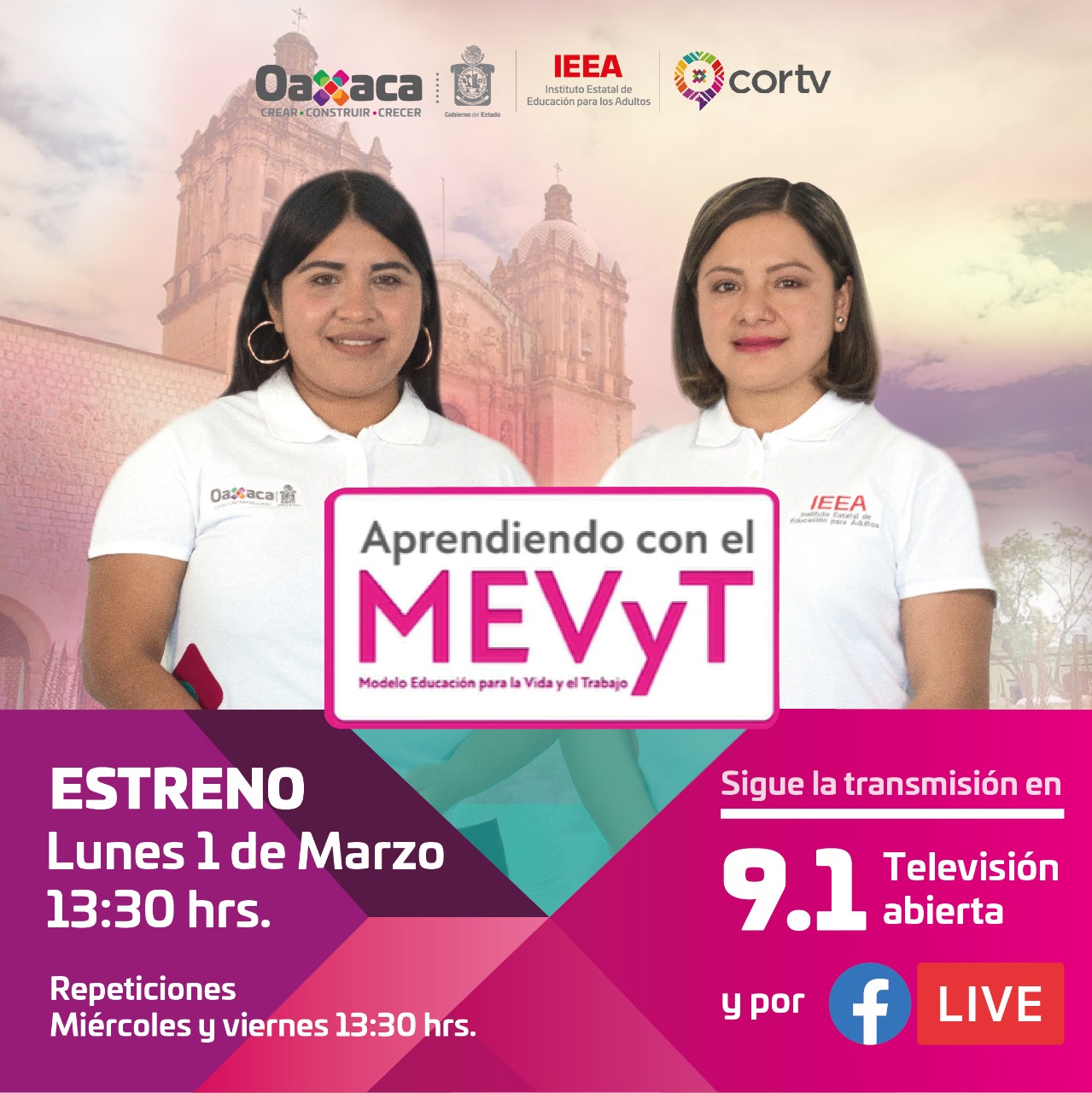 “Aprendiendo con el MEVyT” consta de 15 programas y su estreno será este lunes 01 de marzo a las 13:30 horas por la señal 9.1 de televisión abierta de la CORTV; así como por Facebook Live de ambas dependencias gubernamentales y sus repeticiones los días miércoles y viernes en el mismo horario pero solo por la señal televisiva.
