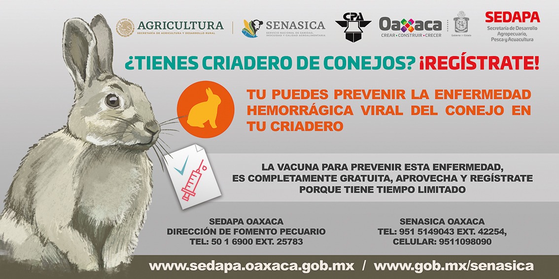 Por esta razón y como medida preventiva, se pondrá en marcha una campaña de vacunación gratuita, invitando a los productores cunículas del estado a registrar sus granjas, por lo que deberán comunicarse a los siguientes números telefónicos: 951 50 16900 Ext. 25783 de la Dirección de Fomento Pecuario de la Sedapa o al 9515149043 Ext. 42254 y 8007512100 del Senasica.