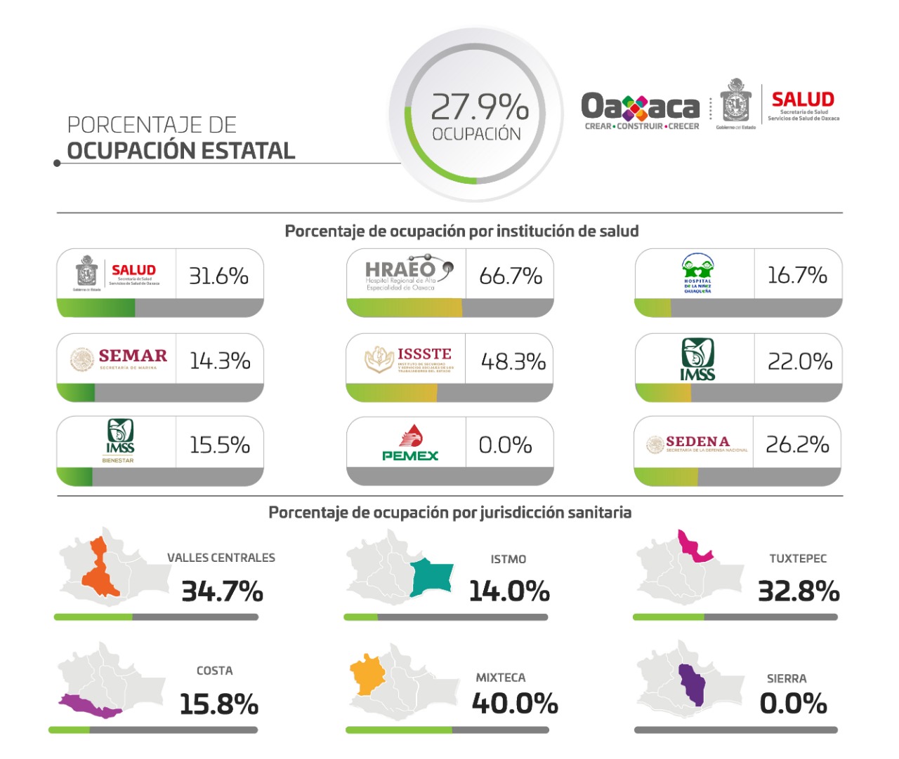 Dijo que la Jurisdicción Sanitaria número uno Valles Centrales contabiliza 29 mil 795 casos confirmados y mil 711 defunciones, el Istmo con tres mil 599 y 521 defunciones, Tuxtepec dos mil 786 y 334 defunciones, Costa dos mil 140 y 222 defunciones, Mixteca tres mil 700 y 306 defunciones y la Sierra mil 519 y 139 defunciones.
