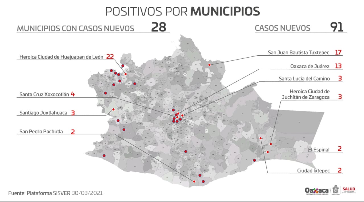 Los 91 casos nuevos se distribuyen en 28 municipios, siendo los que mayor número registran: Huajuapan de León 22; San Juan Bautista Tuxtepec 17; Oaxaca de Juárez 13; Santa Cruz Xoxocotlán cuatro; Juchitán de Zaragoza, Santa Lucía del Camino y Santiago Juxtlahuaca tres cada uno, el resto dos y un caso.