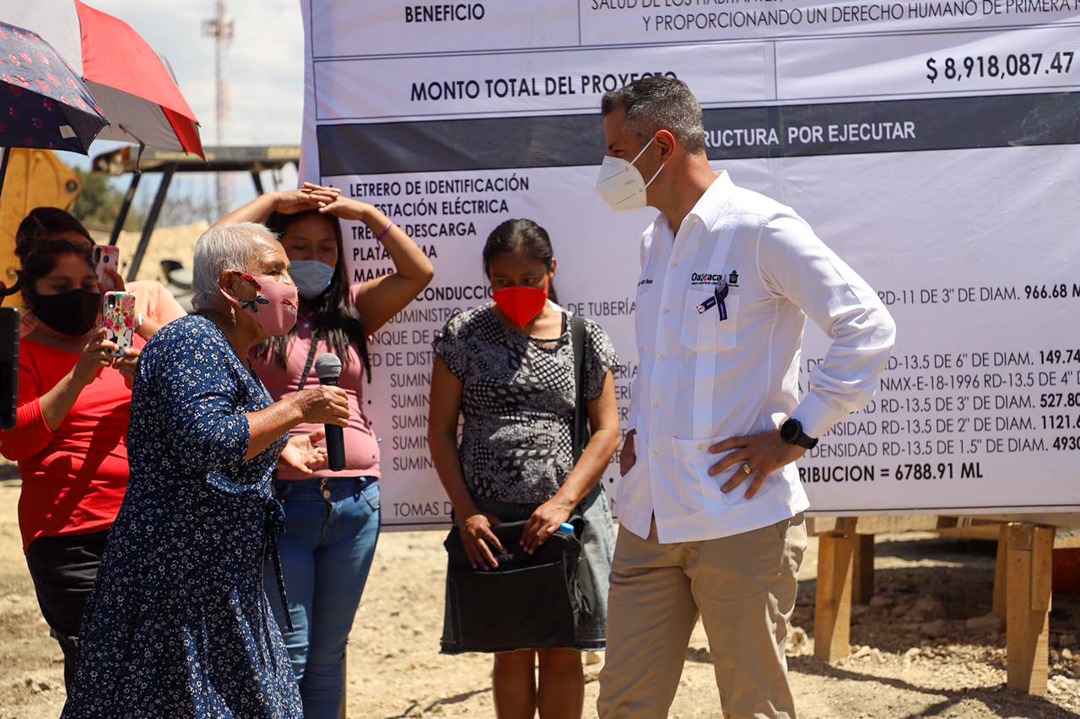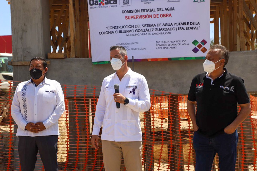 Antes, en el municipio de Villa de Zaachila, el gobernador Alejandro Murat Hinojosa, supervisó la construcción del sistema de agua potable de la colonia Guillermo González Guardado -en su primera etapa-, la cual tiene una inversión de 8.9 millones de pesos -recursos estatales- y tiene un avance del 70%, en donde se instalan 347 tomas, lo que constituye una acción histórica en beneficio de sus habitantes sin costo para ellos.