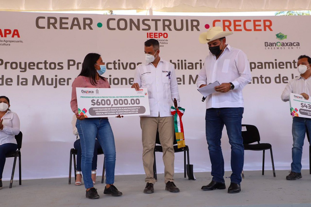 Además de apoyos del Programa Impulso a Proyectos del Sector Alimentario (Pipa) por más de 9 millones 596 mil pesos para la realización de cuatro proyectos en beneficio de 24 productoras y productores. Estos apoyos permitirán la construcción de una bodega de almacenamiento y equipamiento para la planta productora de mezcal artesanal de Santiago Matatlán; la construcción de 10 mil metros cuadrados para la producción de jitomate de San Pablo Guilá; equipamiento de una fábrica artesanal de mezcal en la comunidad de San Lorenzo Albarradas y la ampliación de un invernadero para la producción de tomate en Santa Ana Zegache.