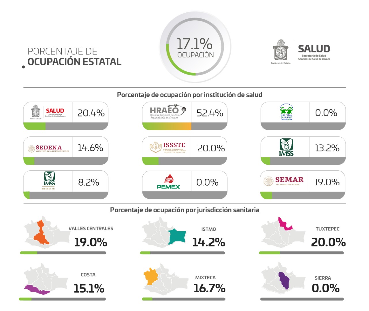 Señaló que los hospitales de Valles Centrales notifican 19% de saturación en el área COVID, Istmo 14.2%, Tuxtepec 20%, Costa 15.1%, Mixteca 16.7%, y Sierra no presenta pacientes.