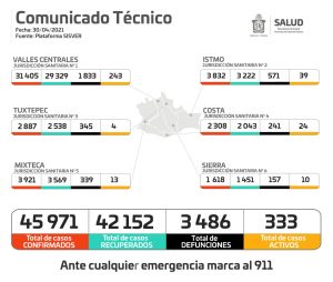 Oaxaca de Juárez, Oax. 30 de abril de 2021.-Los Servicios de Salud de Oaxaca (SSO) registraron 113 contagios nuevos de COVID-19 este 30 de abril, para acumular 45 mil 971 confirmados en la entidad, además de cinco fallecimientos, por lo que el global de defunciones es de tres mil 486.