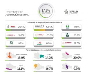 Respecto a la atención médica en la entidad, dijo, se encuentra al 17.1% de camas ocupadas de manera general, 13 pacientes nuevos fueron ingresados a la red hospitalaria y tres nosocomios presentan el 100% de su capacidad.