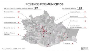 El jefe de la Unidad de Equidad de la Dirección de Atención Médica de la institución, Ramsés Enrique Guevara Zárate, indicó que los pacientes contabilizados este viernes pertenecen a 39 municipios, principalmente Oaxaca de Juárez con 32 notificaciones, seguido de Santa Cruz Xoxocotlán con 10, Heroica Ciudad de Juchitán de Zaragoza con nueve, así como Animas Trujano y Zimatlán de Álvarez con cuatro cada uno, el resto tres, dos y un caso.