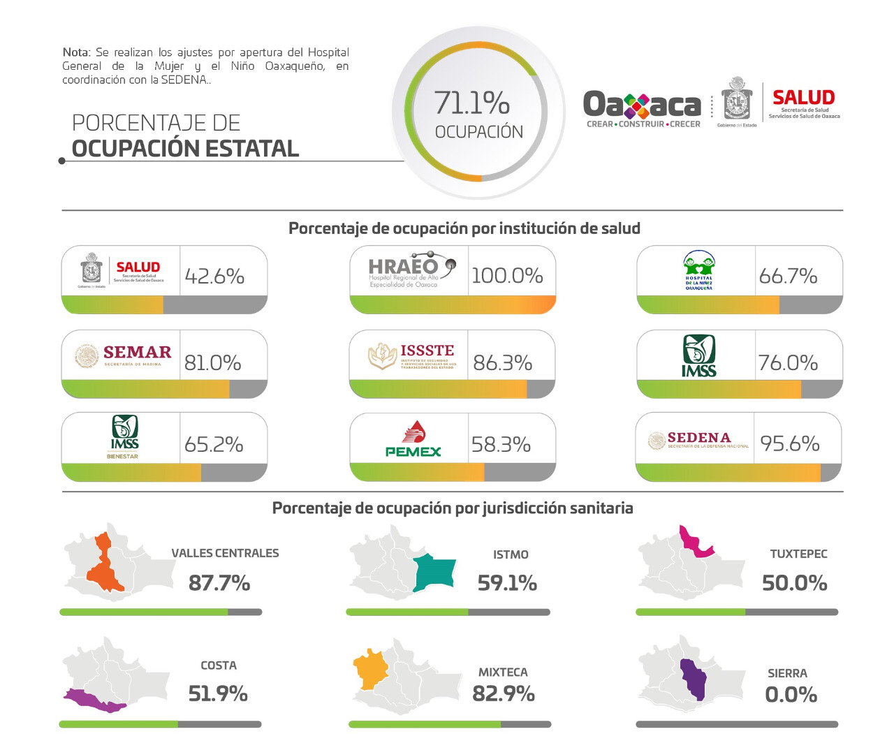 La ocupación global es del 71.1%, la Jurisdicción Sanitaria de Valles Centrales registra un 87.7%, seguido de la Mixteca con 82.9%, Istmo con 59.1%, Costa 51.9%, Tuxtepec 50% y la Sierra 0%.