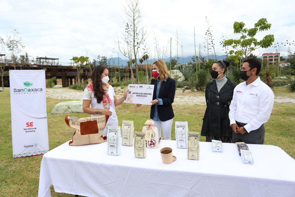 Oaxaca de Juárez, Oax. 31 de agosto del 2021.- Gracias al trabajo, dedicación y esfuerzo con el que día a día las y los emprendedores salen adelante, el estado se fortalece y la economía crece, por ello, la presidenta honoraria del Sistema DIF Oaxaca, Ivette Morán de Murat, en compañía del titular de BanOaxaca, Igmar Medina Matus, entregó créditos a emprendedoras y emprendedores oaxaqueños de Baku Artesanal y Café Costalero.