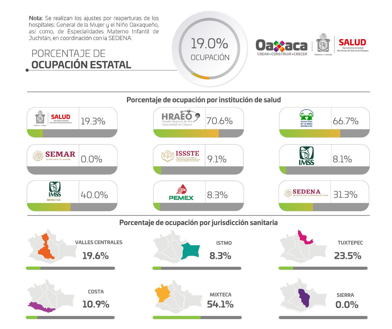 En relación a la ocupación hospitalaria, destaca la Jurisdicción Sanitaria de la Mixteca con 54.1%, seguido de Tuxtepec con 23.5%, Valles Centrales con 19.6%, Costa con 10.9%, Istmo con 8.3% y Sierra continúa sin reportar camas ocupadas.