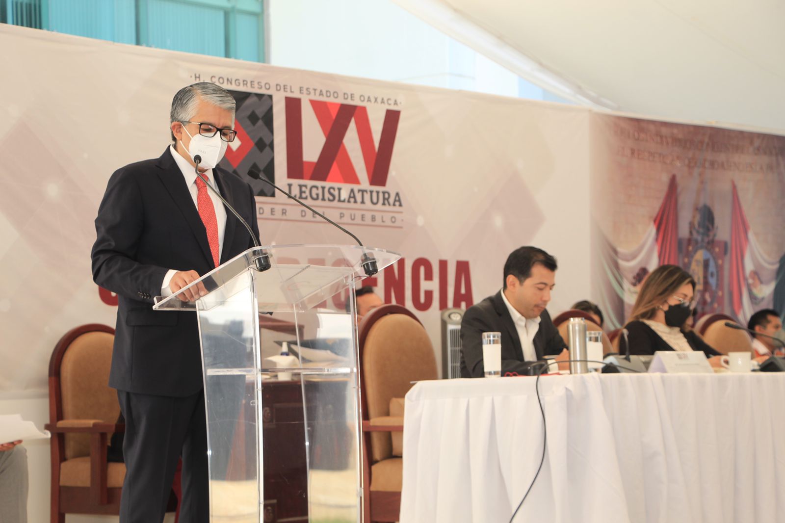 San Raymundo Jalpan, Oax., 3 de febrero de 2022. De acuerdo con lo establecido en el Plan Estatal de Desarrollo 2016-2022, este Gobierno avanza en la consolidación de acciones para fortalecer la cultura de la legalidad, transparencia y rendición de cuentas en beneficio de las y los oaxaqueños, afirmó el titular de la Secretaría de la Contraloría y Transparencia Gubernamental (SCTG) de Oaxaca, José Ángel Díaz Navarro, al comparecer ante el Congreso del Estado en el marco de la Quinta Glosa del Gobierno que encabeza Alejandro Murat Hinojosa.