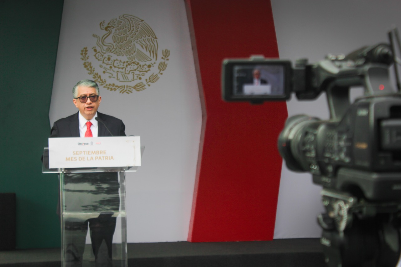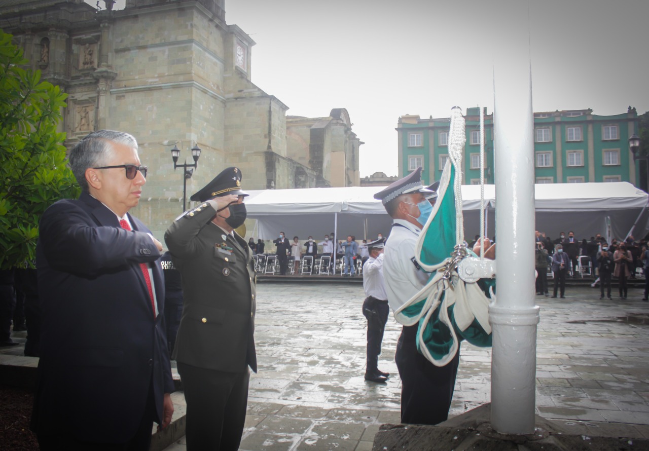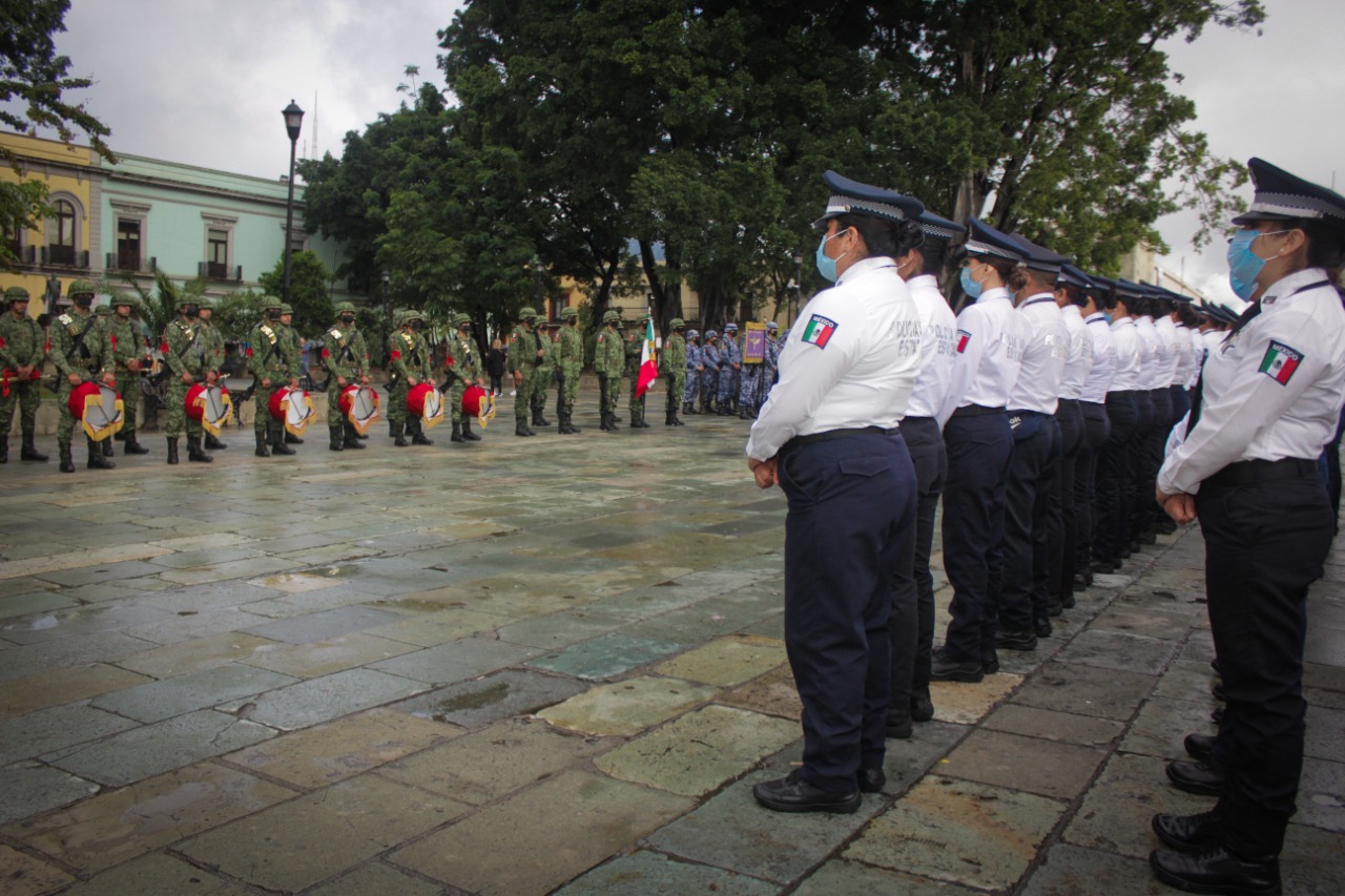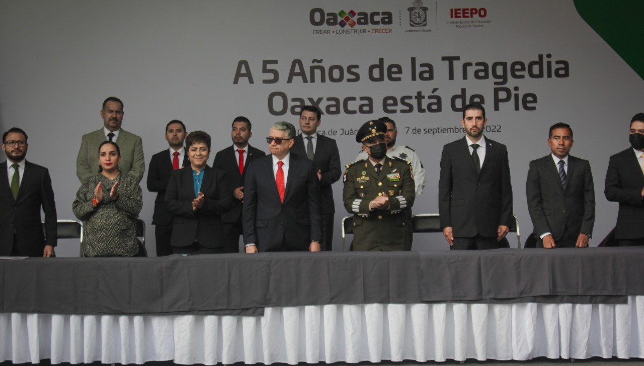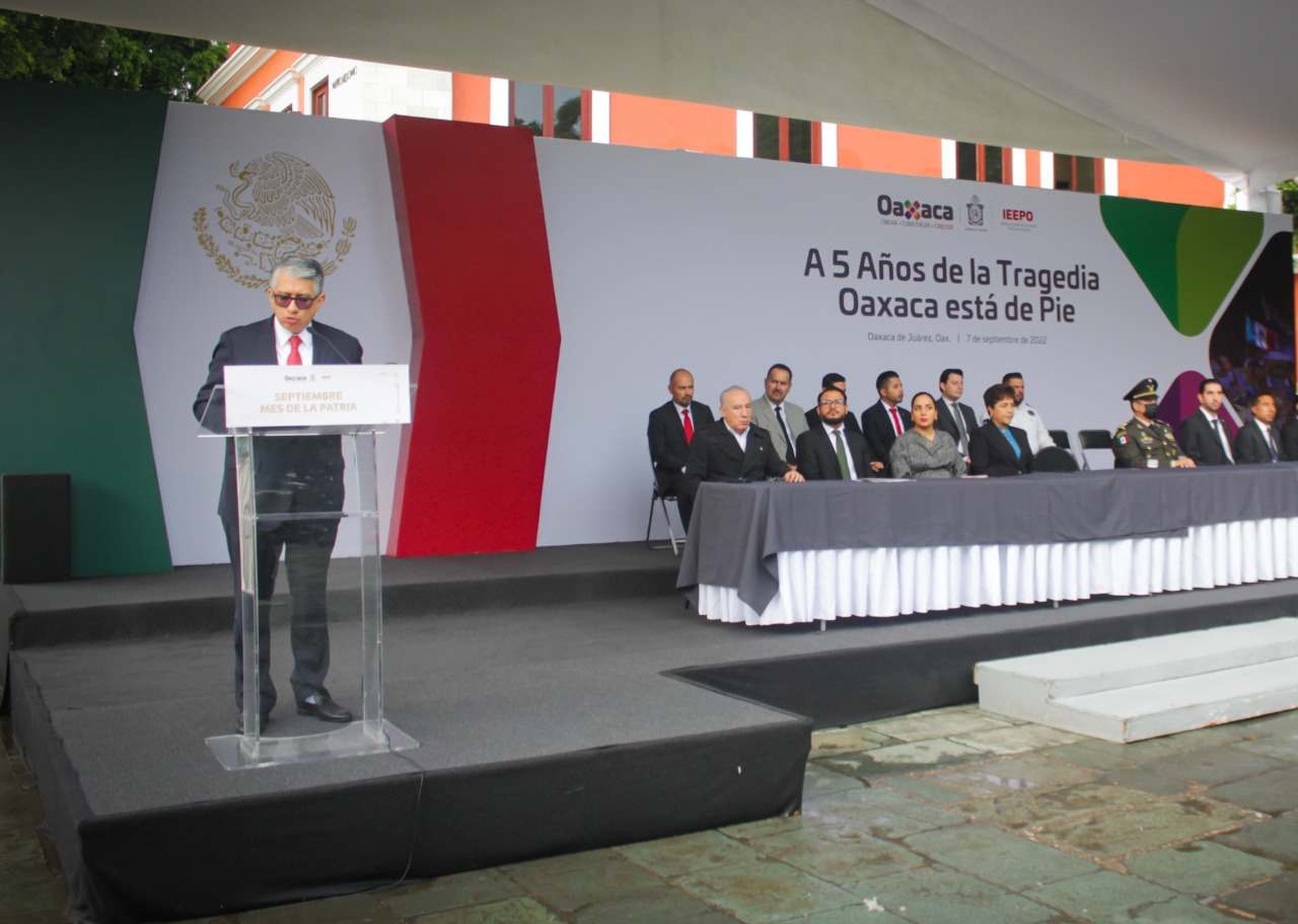 Al lado de funcionarios estatales y flanqueados por corporaciones de seguridad estatales y federales que con sus notas musicales y presencia, rindieron homenaje al lábaro patrio, el Secretario reconoció que la historia sísmica reciente del estado ha representado una dura prueba para el pueblo y el Gobierno de Oaxaca.