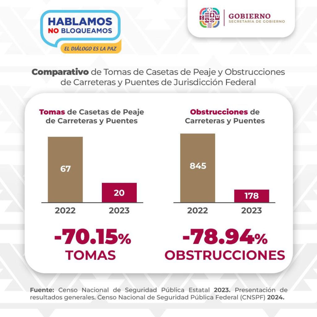 Lo anterior de acuerdo con el comparativo de tomas de casetas de peaje y obstrucciones de carreteras y puentes y comparativo agrario 2022-2023 del Censo Nacional de Seguridad Publica Estatal y Federal 2023.