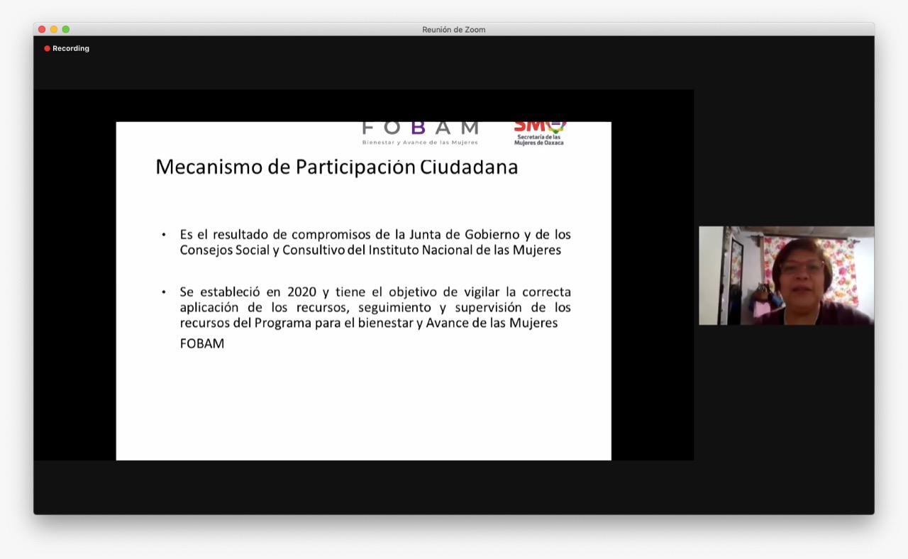 En tanto, Cruz Martínez presentó a las y los participantes y describió el papel del comité, luego de dar a conocer antecedentes de ejercicios de contraloría ciudadana, y destacar el objetivo de fomentar la transparencia, facilitar el acceso a la función pública y propiciar la participación de las personas beneficiadas del FOBAM. Así también definió la ruta para el mecanismo de intervención.