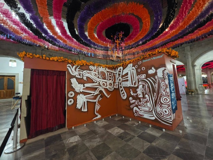 Oaxaca de Juárez, Oax. 30 de octubre de 2025.- La recreación de la Tumba Fría o Tumba 1 de San Pablo Villa de Mitla, que representa la herencia de los pueblos zapotecas que habitaron en lo que actualmente son los Valles Centrales, se expone al interior de Palacio de Gobierno para el disfrute de la población y visitantes.