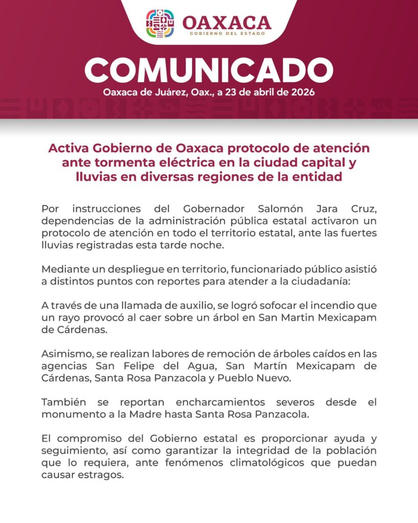 Asimismo, se realizan labores de remoción de árboles caídos en las agencias San Felipe del Agua, San Martín Mexicapam de Cárdenas, Santa Rosa Panzacola y Pueblo Nuevo.