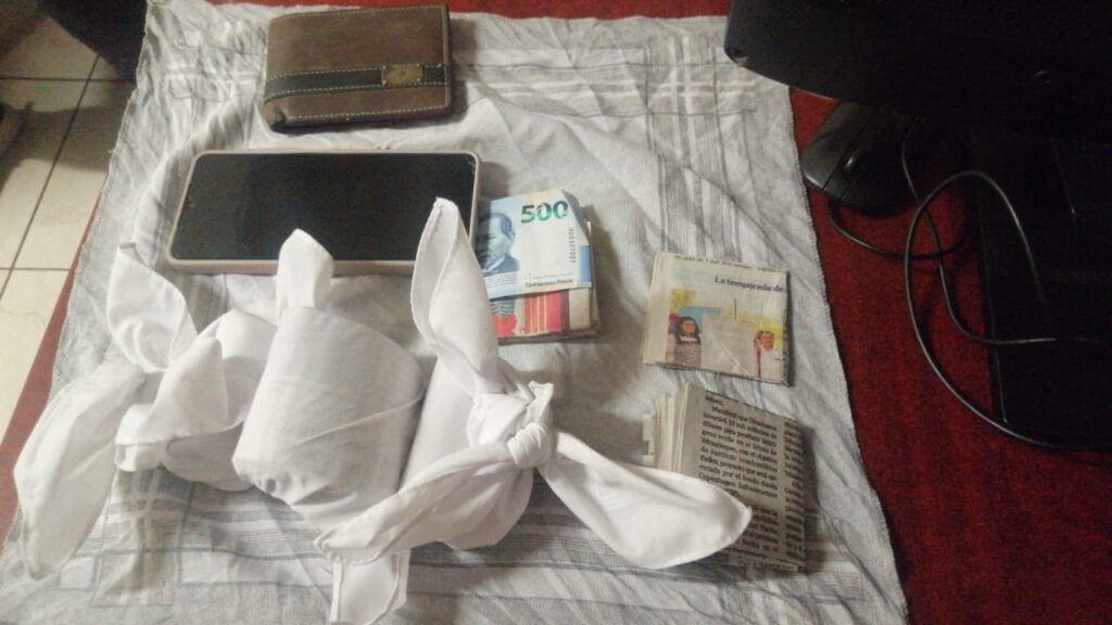 Indicó haber retirado dinero en la calle de Hidalgo esquina con 20 de noviembre y que, a su salida, una mujer la abordó diciéndole que había encontrado un pañuelo con la cantidad de 50 mil pesos. Posteriormente, una segunda persona, del sexo masculino, comenzó a seguirla hasta su llegada al Jardín Sócrates, donde ahora la señalaba de haber tomado dinero de él.