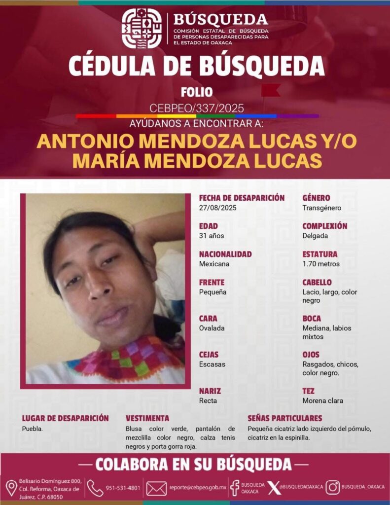 La titular de CLB Oaxaca, Michel Julián López y la jefa de la Unidad de Supervisión y Asistencia de BinniBus Oaxaca, Ana María Armengol Hernández convinieron la difusión en las unidades de este medio de transporte, de la ficha y un video con los datos generales de Antonio Mendoza Lucas o María Mendoza Lucas, quien está reportada como desaparecida desde el 27 de agosto de 2025.