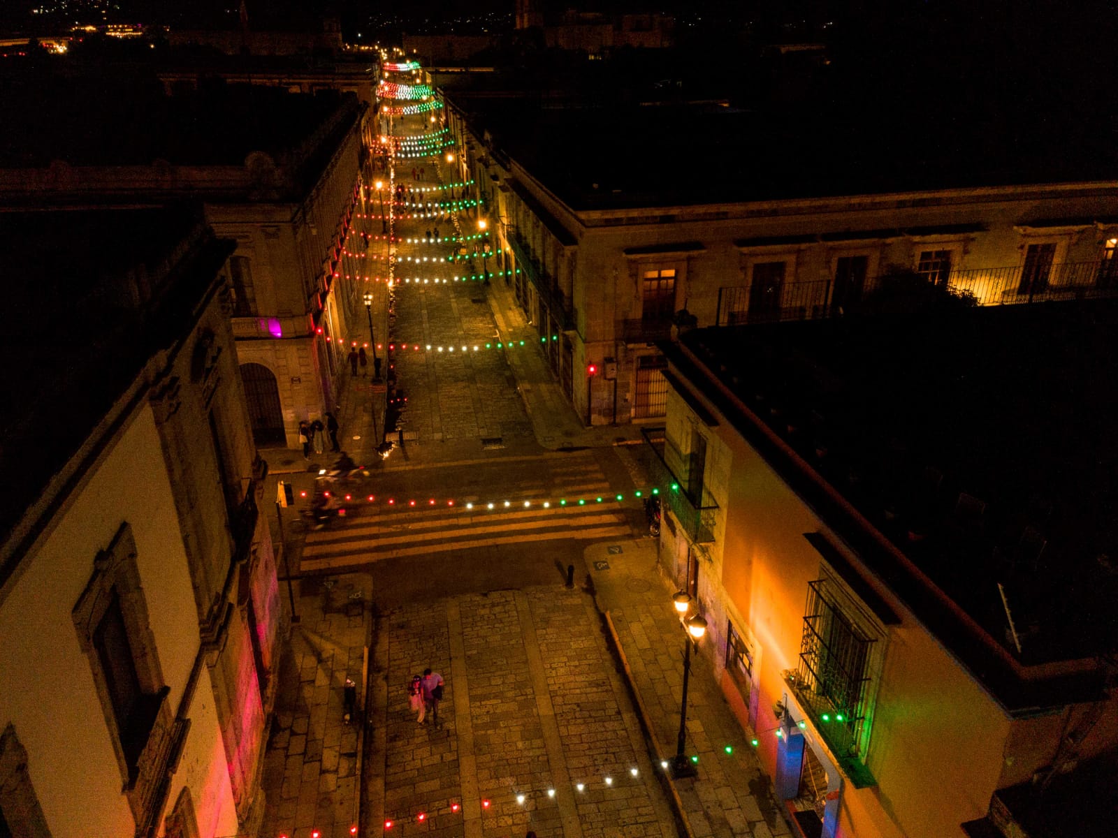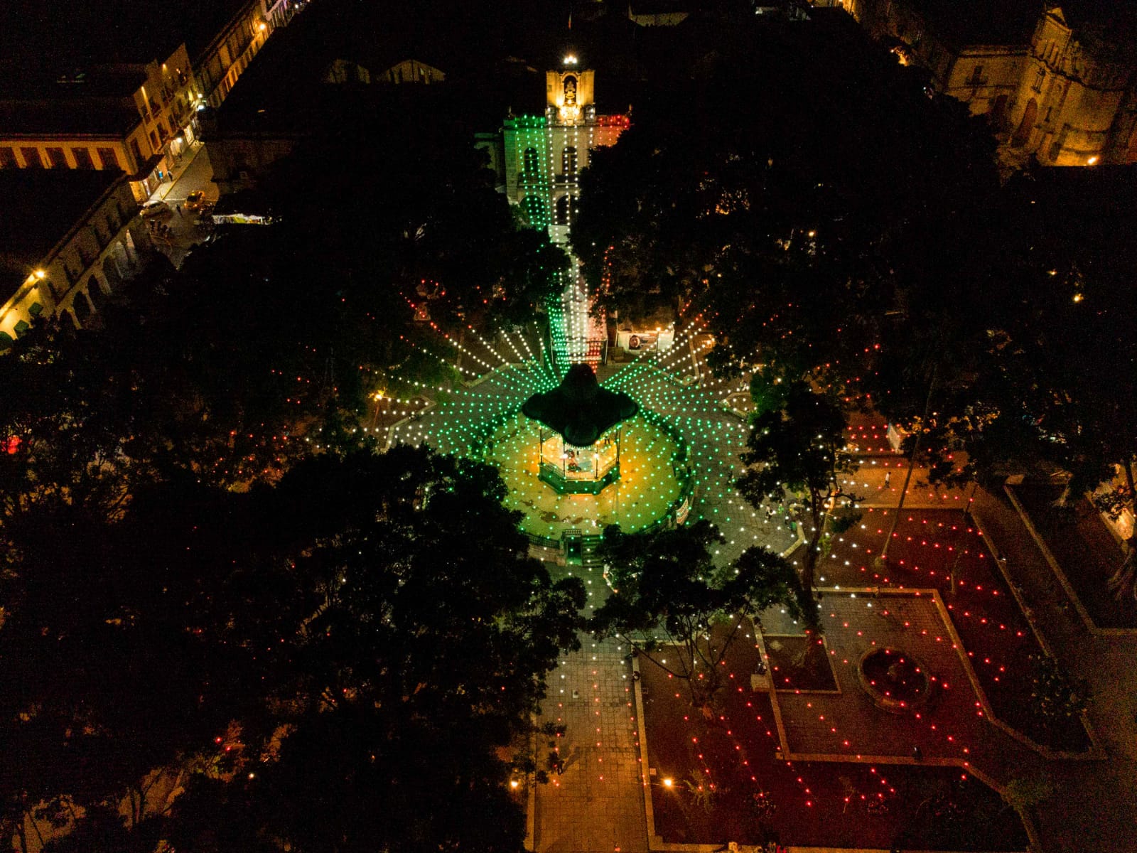 Un equipo de servidoras y servidores públicos del Departamento de Eventos Especiales de esta dependencia colocaron seis mil 600 focos led con luces que hacen alusión a los colores de la bandera mexicana en las calles Manuel García Vigil, Macedonio Alcalá y el zócalo de la capital.