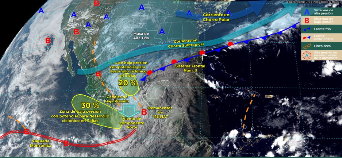 Lo anterior, derivado de la amplia circulación y bandas nubosas de la baja presión remanente “Julia”, las cuales ocasionarán una fuerte convergencia en niveles bajos y medios de la atmosfera. Este temporal se desarrollará en el Istmo, Costa, Cuenca del Papaloapan y Sierra Sur, donde podrían existir acumulados mayores a 100 milímetros por lluvias intensas que se extenderán hasta el miércoles.