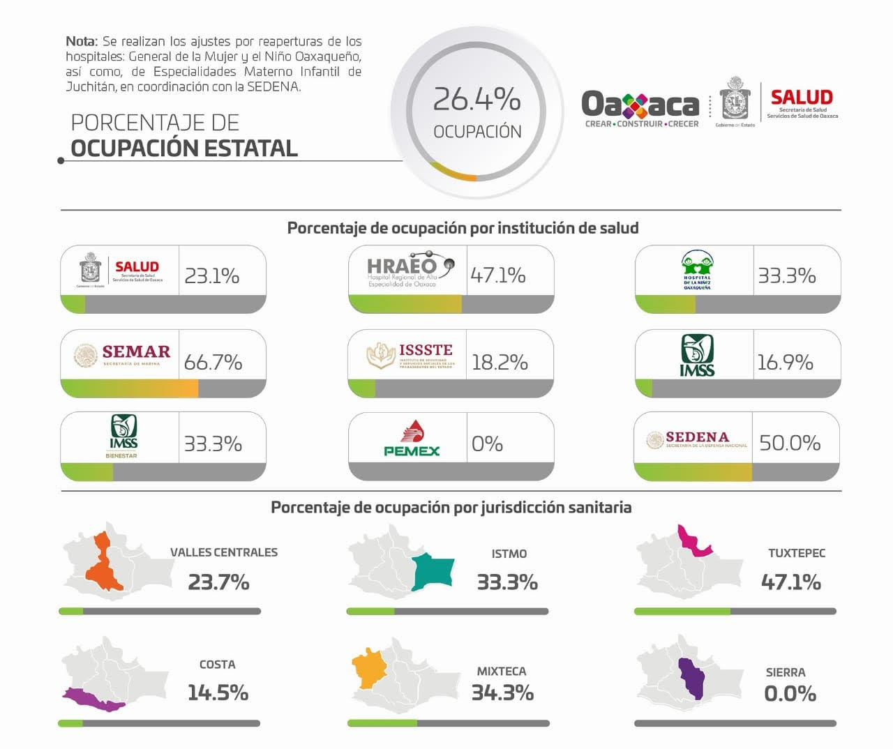 En relación al índice de hospitalizaciones, la ocupación de camas para la atención de la emergencia sanitaria se encuentra de manera general al 26.4%, por Jurisdicción Sanitaria, Valles Centrales notificó 23.7%, Istmo 33.3%, Tuxtepec 47.1%, Costa 14.5%, Mixteca 34.3%, y la Sierra se mantiene sin pacientes hospitalizados.