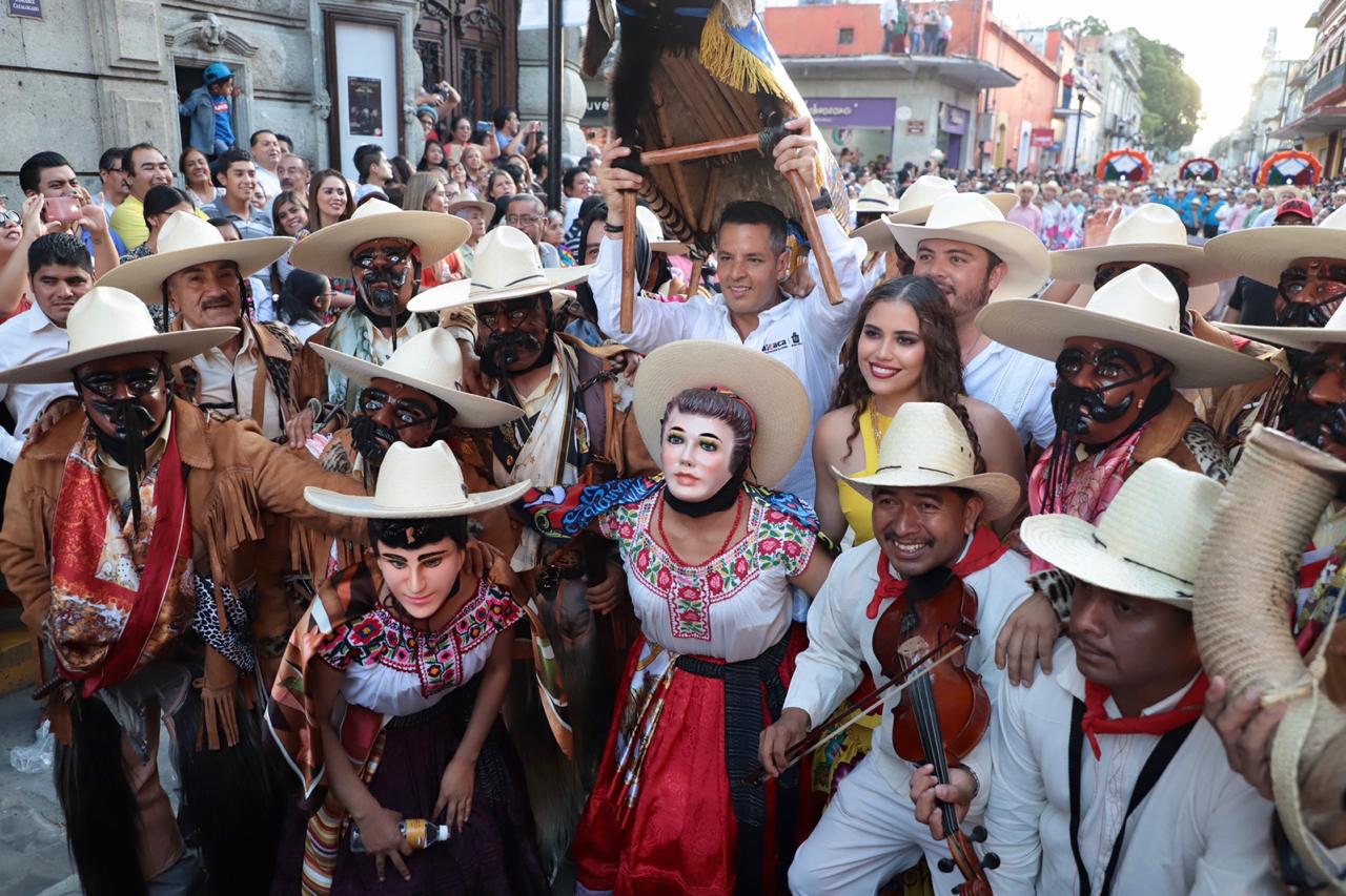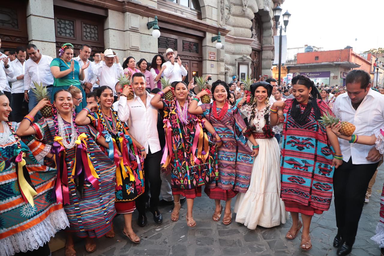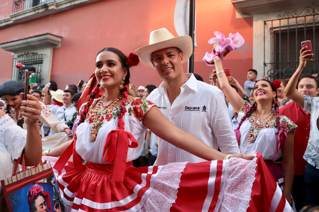 Con canastas adornadas con flores reposando sobre sus cabezas, las Chinas Oaxaqueñas –ataviadas con faldas de gran vuelo, blusa blanca y rebozo- fueron las primeras en dar color a esta fiesta, y junto con los monos de calenda, los maramoteros y los faroleros que las acompañan, invitaron a bailar el tradicional Jarabe del Valle.