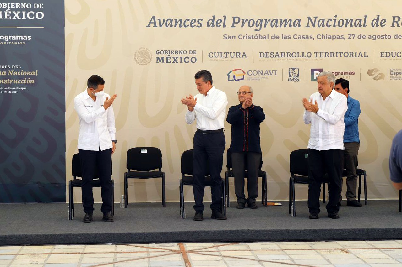 San Cristóbal de las Casas, Chiapas. 27 de agosto de 2021. El gobernador de Oaxaca, Alejandro Murat Hinojosa, y el Presidente de México, Andrés Manuel López Obrador, realizaron la supervisión de los Avances del Programa Nacional de Reconstrucción en Oaxaca, encaminado a atender los daños totales que se registraron por los sismos del 20217 y 2018.