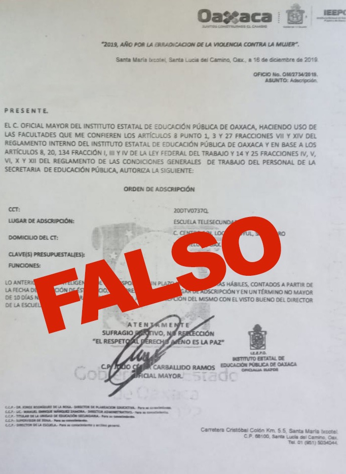 - Recomienda acudir ante la Dirección Administrativa o la Delegación de Servicios Regionales del IEEPO para revisar la legalidad y autenticidad de documentos oficiales como las órdenes de adscripción