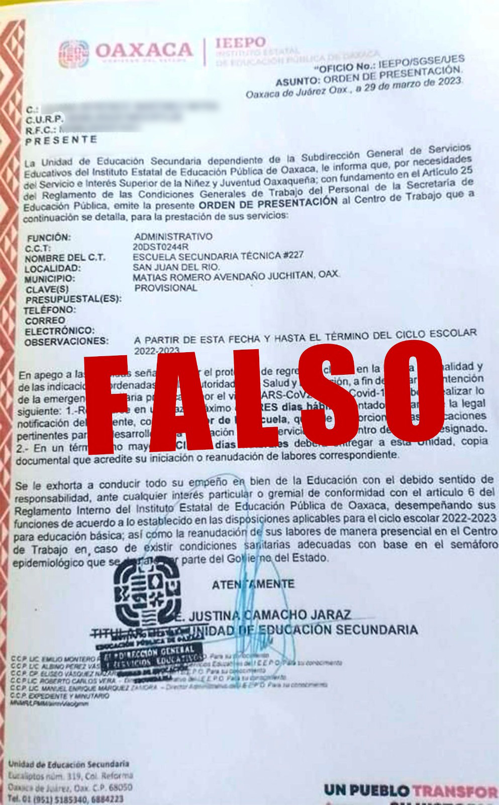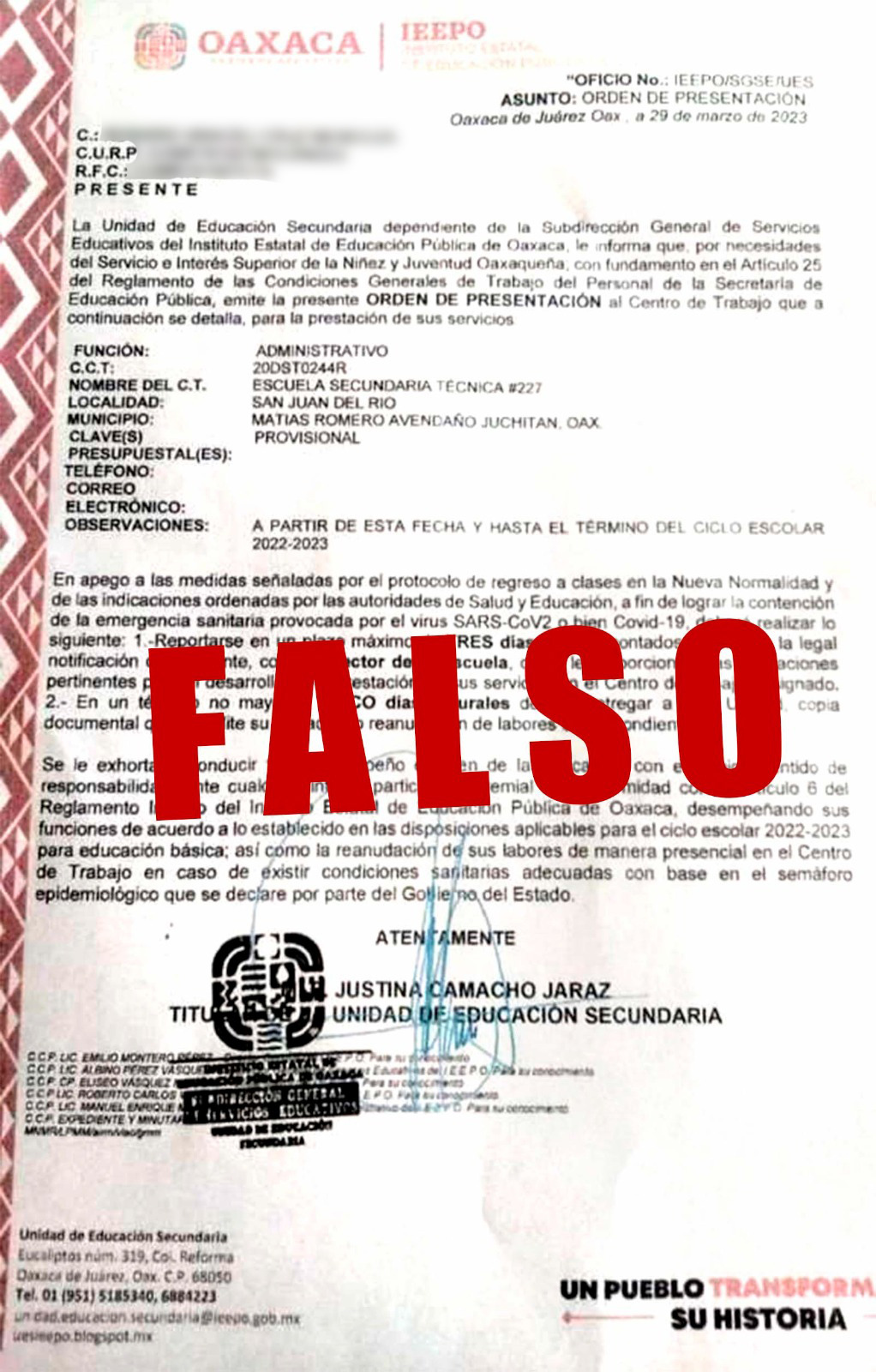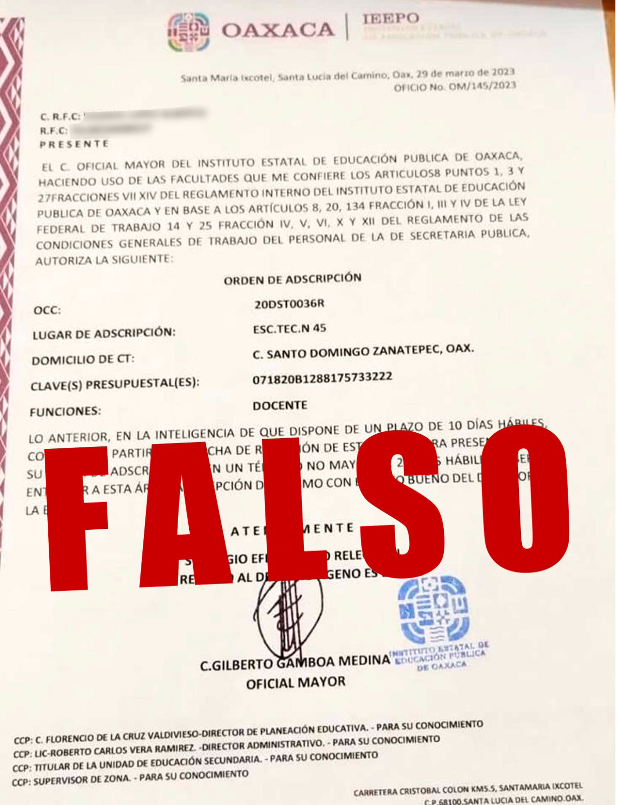 Oaxaca de Juárez, Oax. 21 de abril de 2023.- El Instituto Estatal de Educación Pública de Oaxaca (IEEPO) detectó la falsificación de documentos con el membrete oficial y sellos de la dependencia, por ello, alerta a la comunidad docente y sociedad en general sobre este tipo de fraudes que constituyen un delito grave.