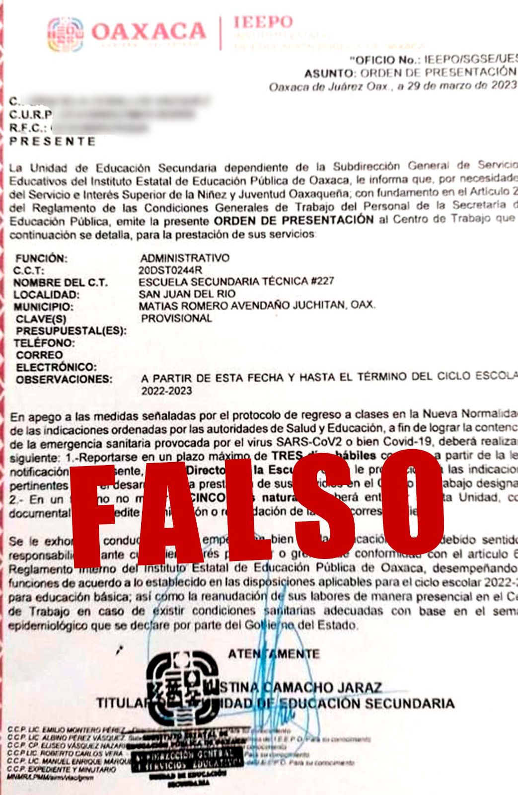 Entre los documentos apócrifos que se emiten se encuentran órdenes de adscripción, oficios de presentación para la incorporación de docentes al sistema educativo o el cambio de centros de trabajo.