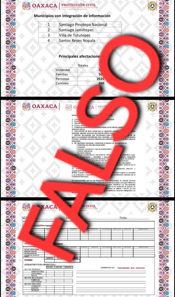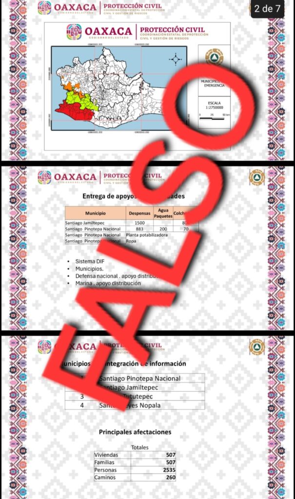 Dicho material muestra algunos municipios de la región de la Costa afectados por el huracán John, apoyos brindados, municipios con integración de información, así como una supuesta solicitud de declaratoria, por lo que se pide a la ciudadanía hacer caso omiso de la misma.