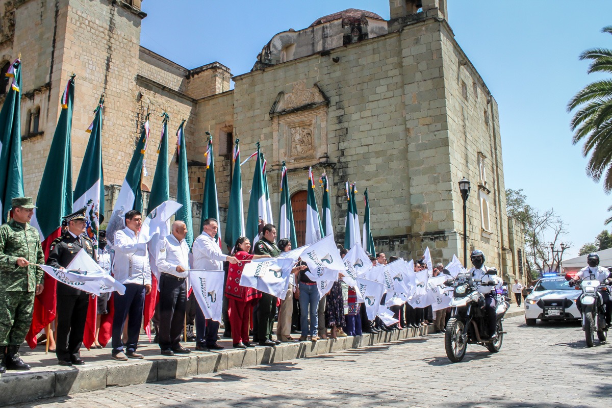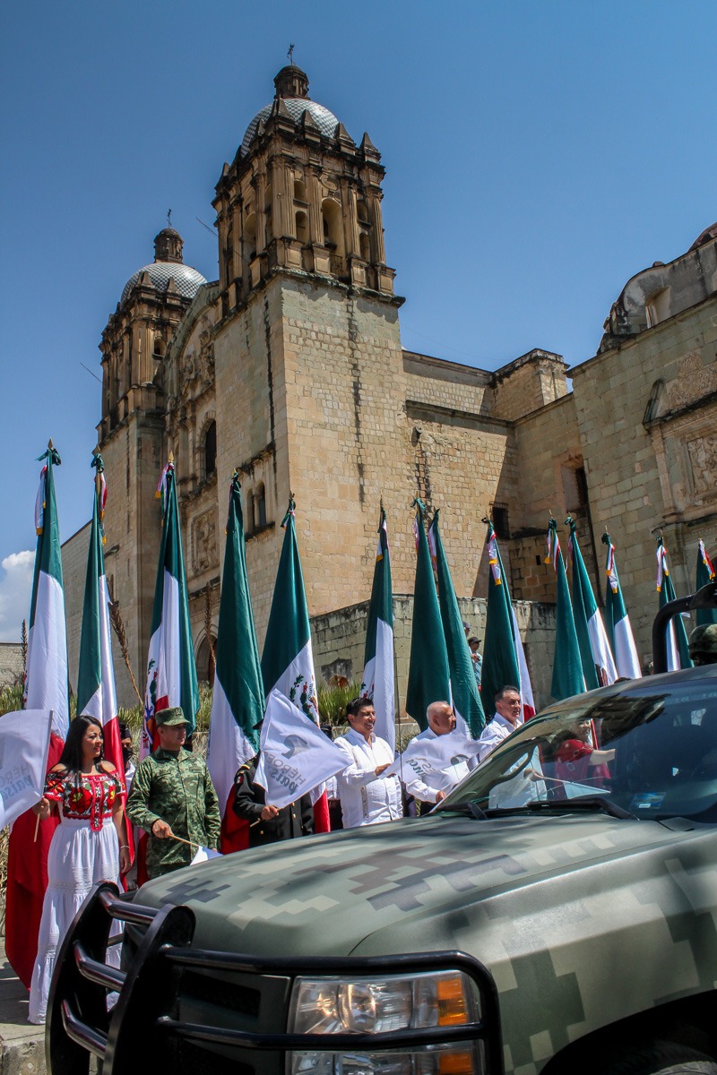 Teniendo a un costado el emblemático exconvento de Santo Domingo de Guzmán, en el Jardín El Pañuelito, el Gobernador del Estado Salomón Jara Cruz junto con el comisionado del INM Francisco Garduño Yáñez dieron el banderazo de salida de las unidades de motor que participarán en estas acciones, las cuales tienen como fin brindar atención, seguridad y protección, salvaguardando sus derechos, a quienes llegarán a la entidad por el período vacacional.