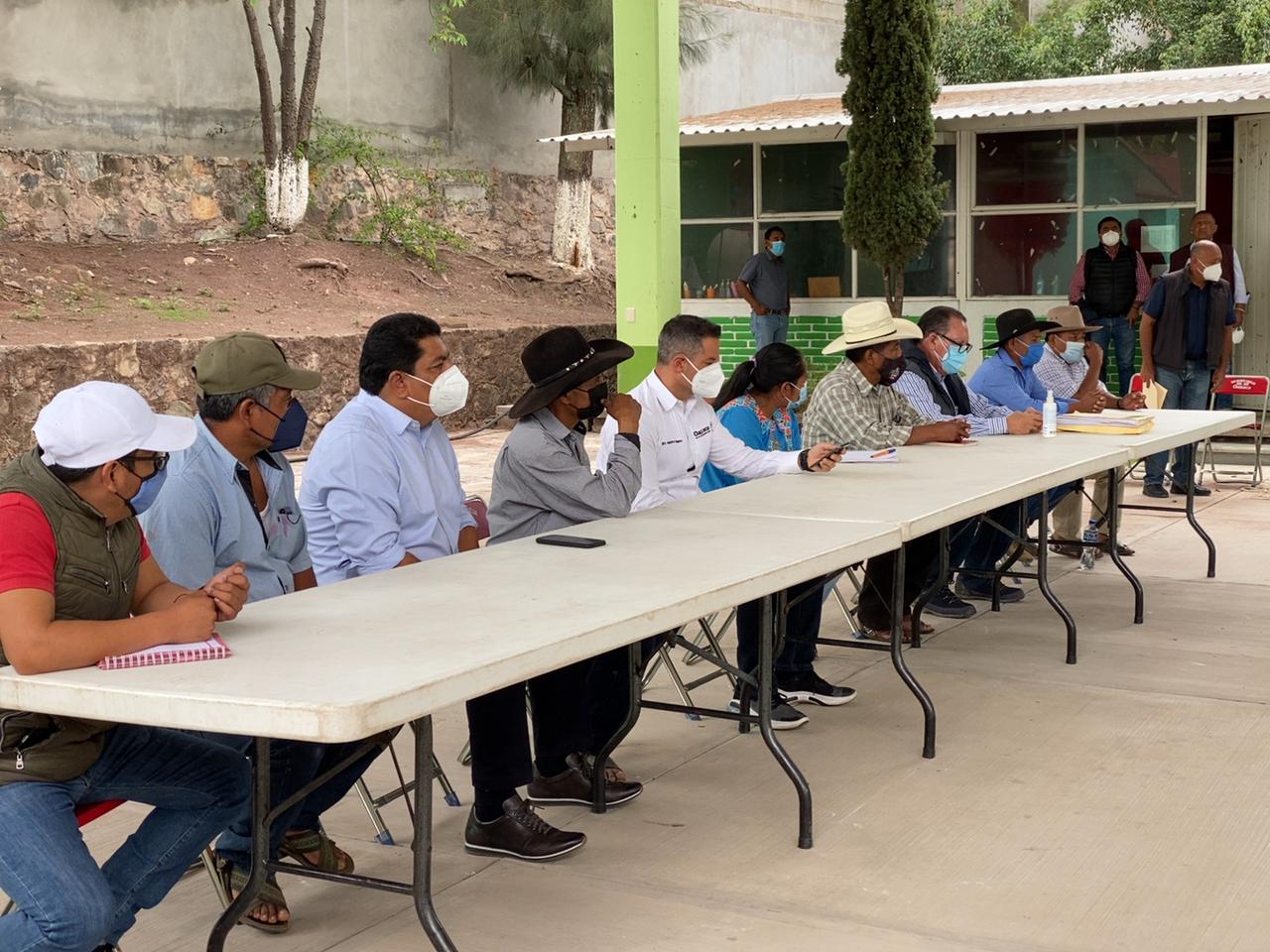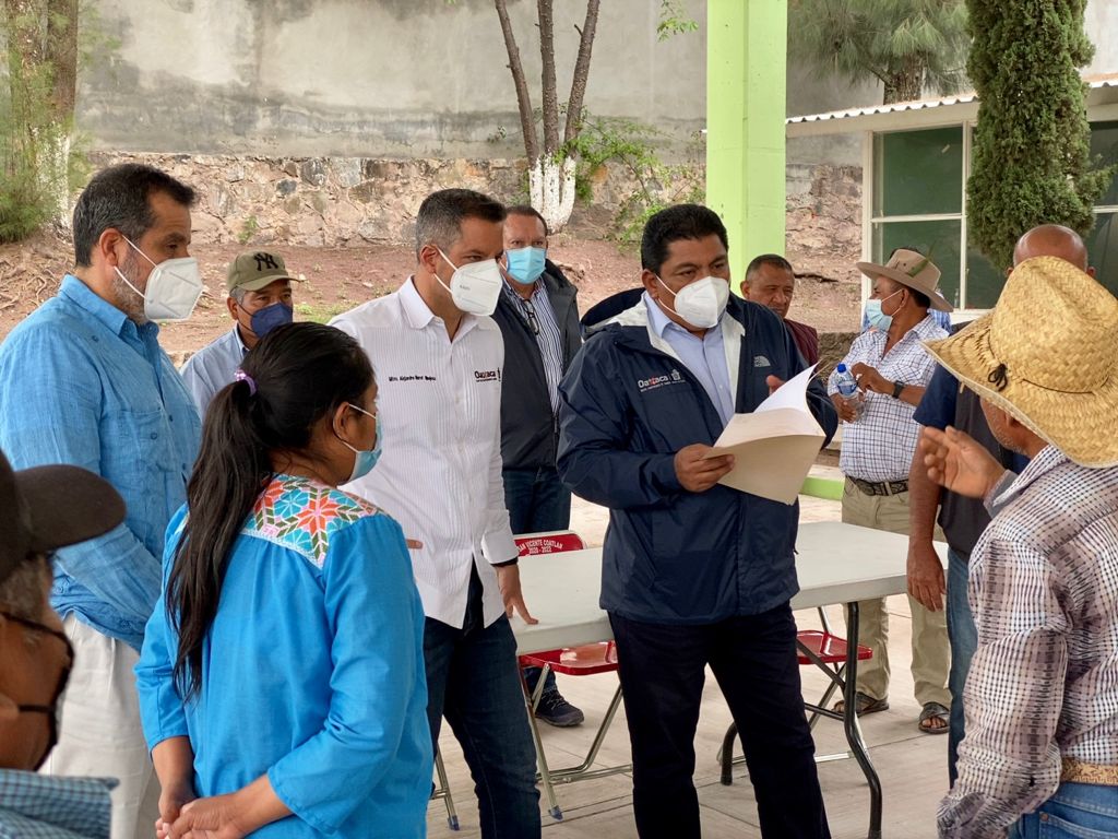 San Vicente Coatlán, Ejutla, Oax. 10 de junio de 2021. Este día el mandatario estatal, Alejandro Murat Hinojosa, junto con el secretario General de Gobierno, Francisco Javier García López; el director general del centro SCT Oaxaca, José Luis Chida Pardo y el representante de la Procuraduría Agraria en Oaxaca, Gonzalo Villalobos López, sostuvieron una reunión de trabajo con autoridades municipales, comunales y habitantes de San Vicente Coatlán.
