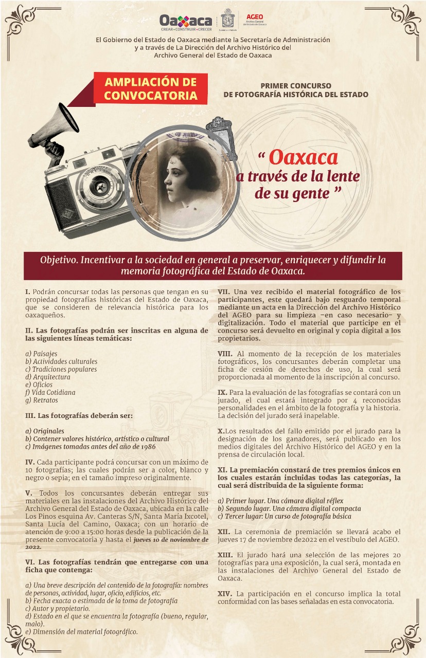 Tlalixtac de Cabrera, Oax. 27 de octubre de 2022.- Gracias a la buena recepción y por petición de la población oaxaqueña, el Archivo General del Estado de Oaxaca (AGEO), órgano desconcentrado de la Secretaría de Administración, ampliará la fecha y cobertura de la convocatoria del Primer Concurso de Fotografías Históricas “Oaxaca a través de la lente de su gente”, dando oportunidad para que más personas puedan participar en esta iniciativa.