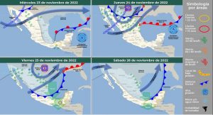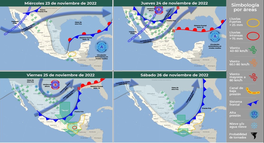 La CEPCO resaltó que, para la mitad de semana, una nueva masa de aire polar empujará un nuevo frente frío, el cual reforzará los prolongados remanentes del sistema frontal 10. No se advierte tiempo severo para el estado, sin embargo, las bajas temperaturas y el evento de norte en el oriente del Istmo, así como niebla muy densa en zonas serranas, dominarán en este periodo.