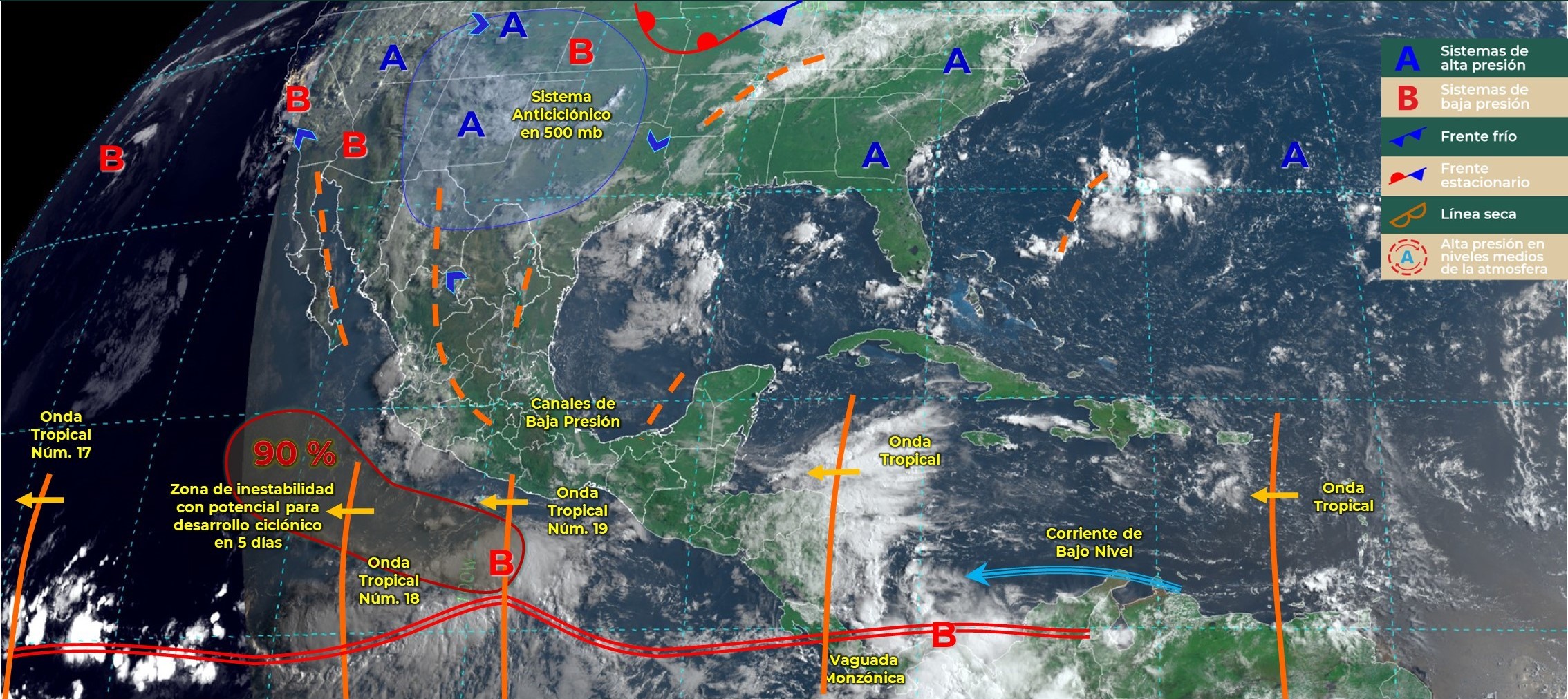 Finalmente, Protección Civil de Oaxaca detalló que la zona de baja presión al sur de las costas de Guerrero, mantiene el 70% de probabilidad de desarrollo ciclónico en 48 horas y 90% en 5 días. Esta mañana se localizaba a 535 kilómetros al sur de Acapulco, y se desplazaba hacia el oeste-noroeste, entre 15 y 25km/h.