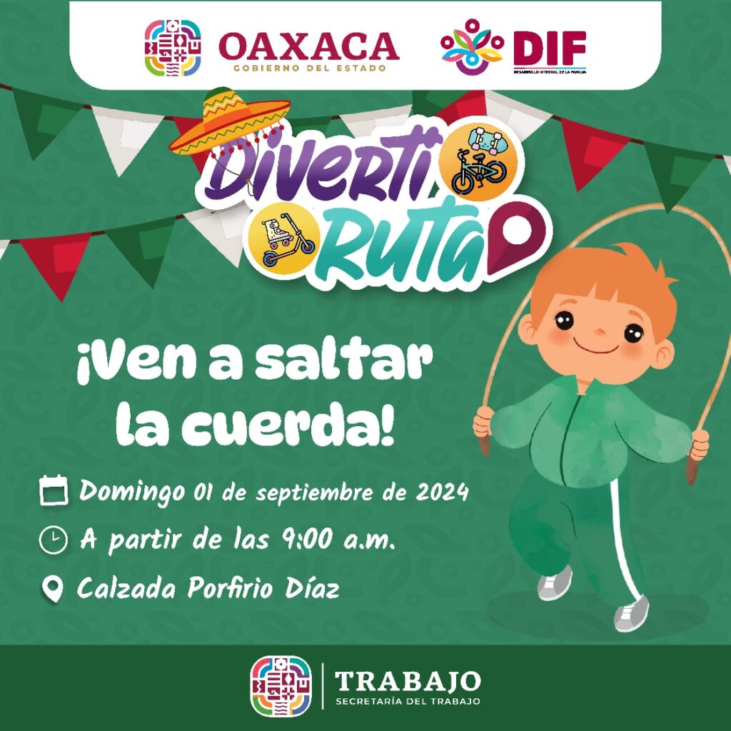 Oaxaca de Juárez, Oax., 28 de agosto de 2024.- Comienza septiembre y la celebración de las fiestas patrias es la temática que motiva a la vigésima edición de la Diverti Ruta a llevarse a cabo este domingo 1 de septiembre, sobre la calzada Porfirio Díaz en la capital oaxaqueña, en un horario de 9:00 a 13:00 horas.