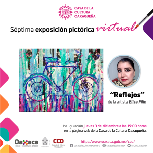Oaxaca de Juárez, Oax., 03 de diciembre de 2020.– La Secretaría de las Culturas y Artes de Oaxaca (Seculta) a través de la Casa de la Cultura Oaxaqueña (CCO), inaugura este jueves a las 19:00 horas, su séptima exposición pictórica virtual denominada “Reflejos”, con piezas de la artista oaxaqueña Elisa Filio.