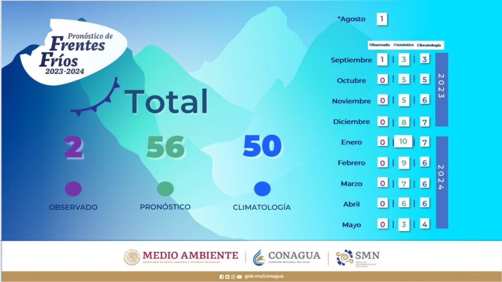 En la presente temporada, que va de septiembre de 2023 a mayo de 2024, se espera el arribo de 56 frentes fríos, distribuidos de la siguiente manera: en septiembre 3, octubre 5, noviembre 5, diciembre 8, enero 10, febrero 9, marzo 7, abril 6 y en mayo 3, de los cuales,12 pudieran tener efectos directos en el estado con descensos en las temperaturas.