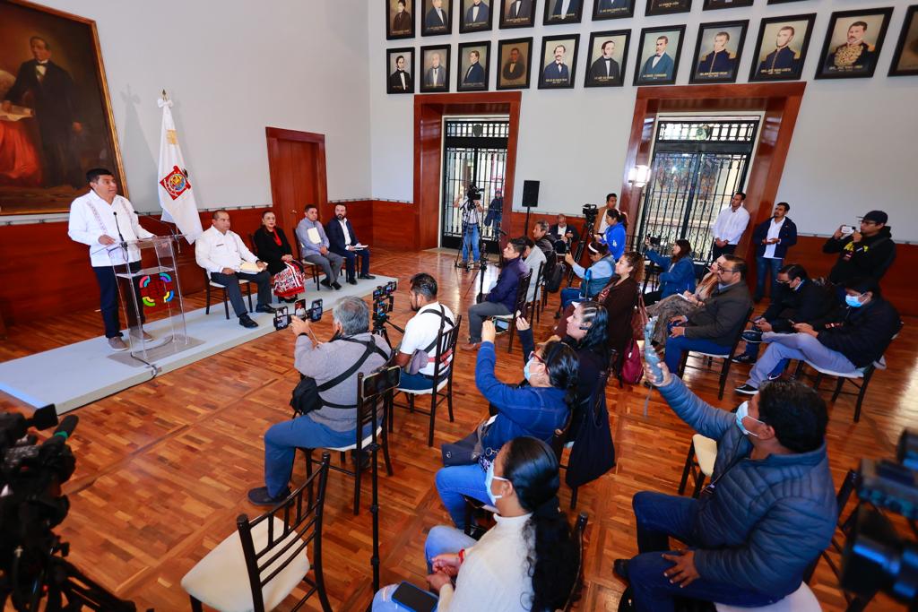 Oaxaca de Juárez, Oax., 5 de diciembre de 2022.- El Gobernador de Oaxaca, Salomón Jara Cruz realizó la primera conferencia de prensa bajo la premisa de máxima transparencia y rendición de cuentas, estrategia de comunicación mediante la cual hará públicas todas las acciones de gobierno.